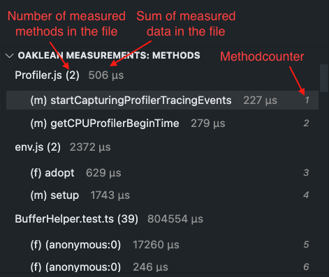 The "Methods" section in the left panel displays all measured functions/methods in the files. The measurement value and the count of the method/function are displayed next to it. Clicking on the method opens the corresponding file in the editor and navigates to the relevant code.